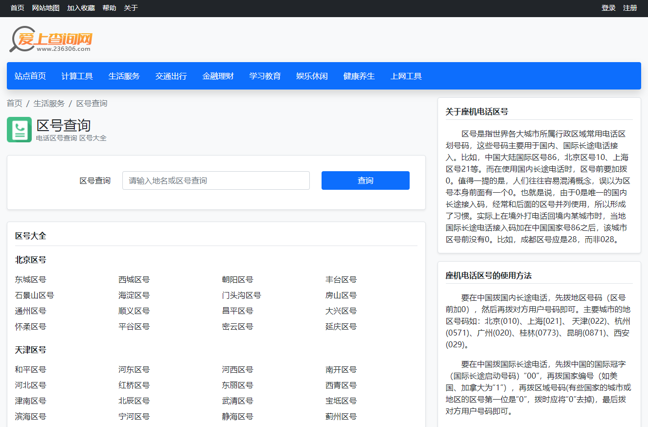 爱上查询网区号查询站点(quhao.236306.com)上线,目前已经覆盖中国大陆地区,港澳台等部分地区信息还在整理中。平台支持按区号查询,或输入区县以上级地名进行查询。欢迎前往体验使用,如果有好的建议也欢迎反馈告诉我们。