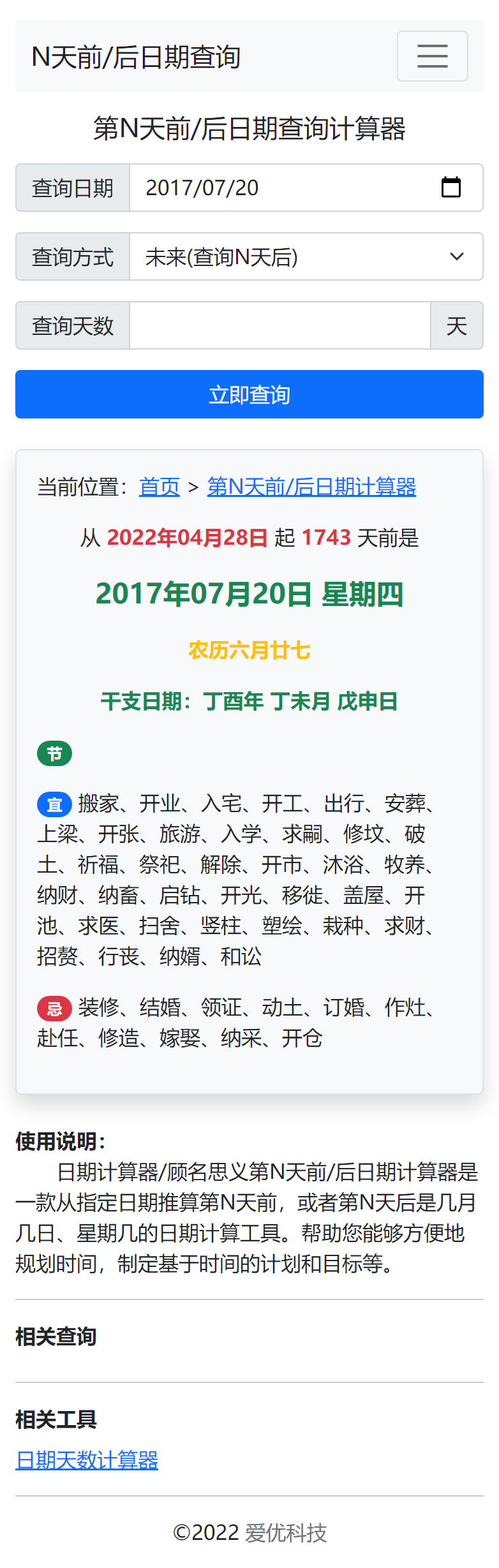经过一段时间的筹划,第N天前/后日期查询计算器工具上线,这是继日期间隔天数计算器后爱优科技研发的第2款日期查询计算工具。